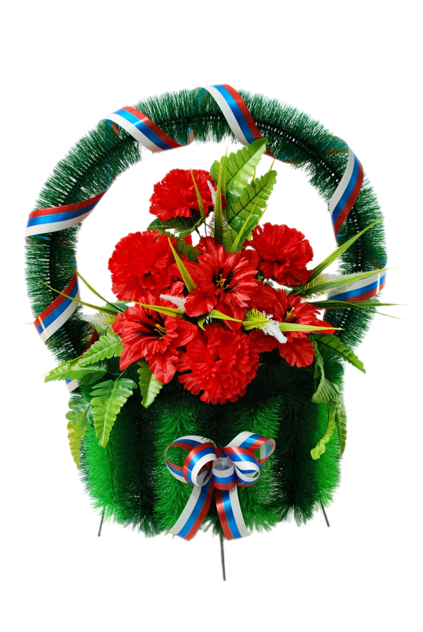 Корзина ритуальная из искусственных цветов. Высота 52 см., высота ножек 10 см., общая высота 62 см. Ширина 43 см. Ерш изумруд d=7 см., ерш цветной d=7 см. Цветовая гамма корзины может меняться.